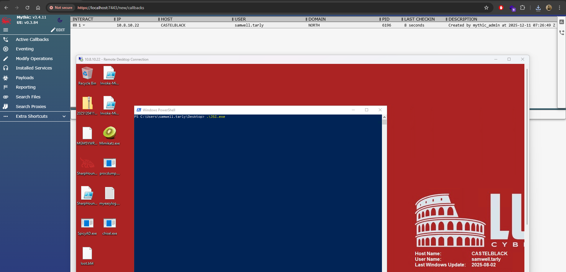 Next, on my GOAD lab’s attack path, I executed the payload on SRV01 (10.8.10.22). The callback appeared in Mythic under user Samwell.Tarly.