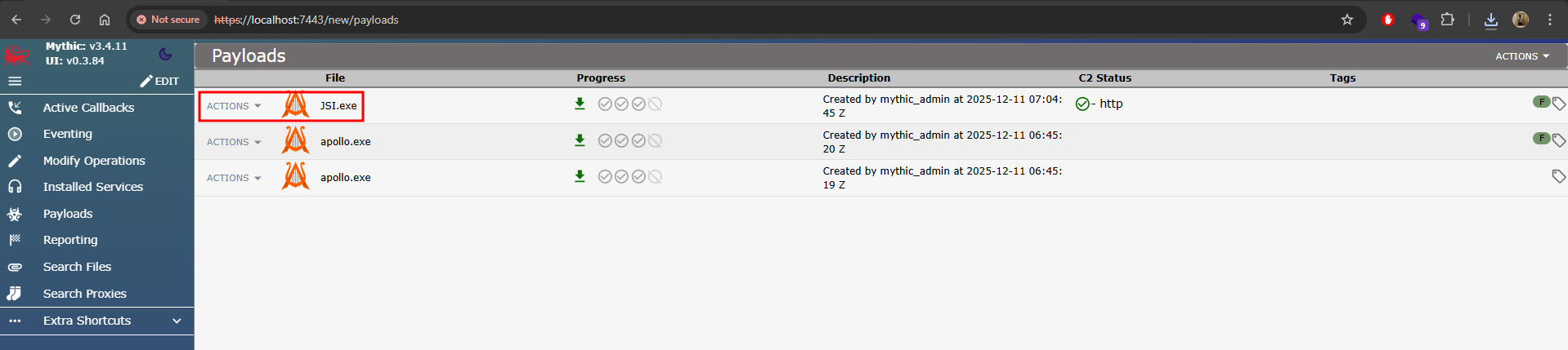From there, I generated a payload to receive a callback. Mythic immediately showed that the payload was created successfully: