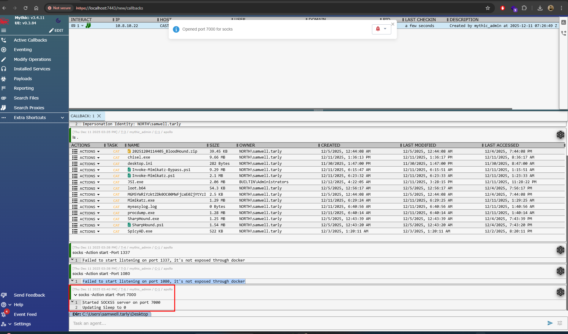 - Port 7000 forwards the SOCKS proxy running through Mythic